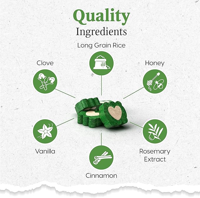 • ALL NATURAL DENTAL CHEW: The patented toothpaste soft center chew fights plaque, tartar and bacteria causing bad breath with natural ingredients such as alfalfa, cinnamon, vanilla, and clove.