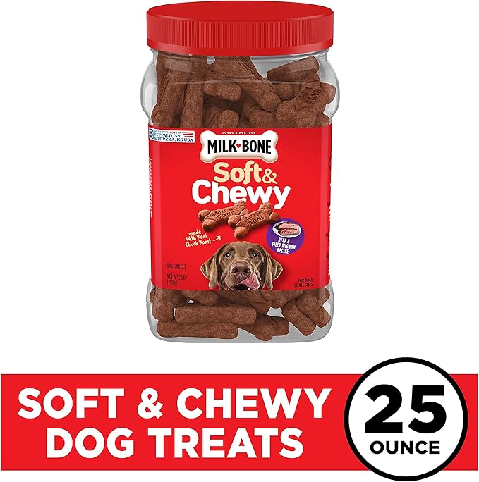 • Contains one (1) 25-ounce container of Milk-Bone Soft & Chewy Beef & Filet Mignon Recipe With Chuck Roast dog treats