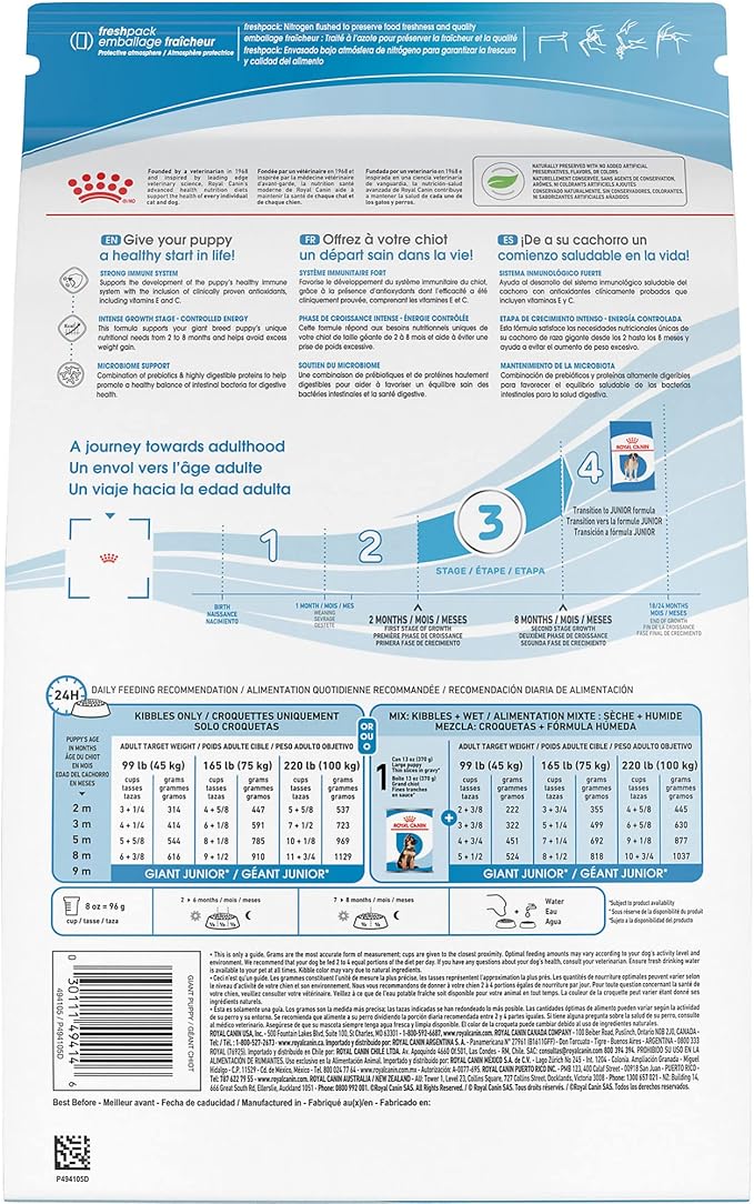 • PUPPY ESSENTIALS AS THEY GROW: When giant puppies reach 8 months, switch them to Royal Canin Giant Junior to support their muscle development stage up to 24 months old