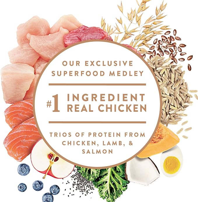 • Features trio of protein from chicken, lamb, and salmon—chicken is the ingredient—specially formulated for puppies (except for growth of large size dogs 70lbs or more as an adult)