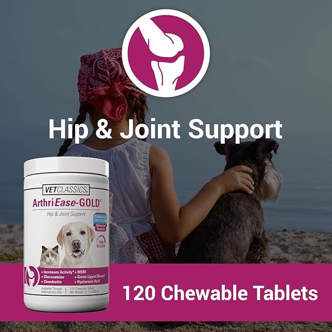 Vet Classics ArthriEase-Gold Hip & Joint Support for Dogs, Cats, Horses – Chewable Tablet Health Supplement – Alleviate Aches, Discomfort – for Flexibility, Healthy Joint – Antioxidant - 120 Ct