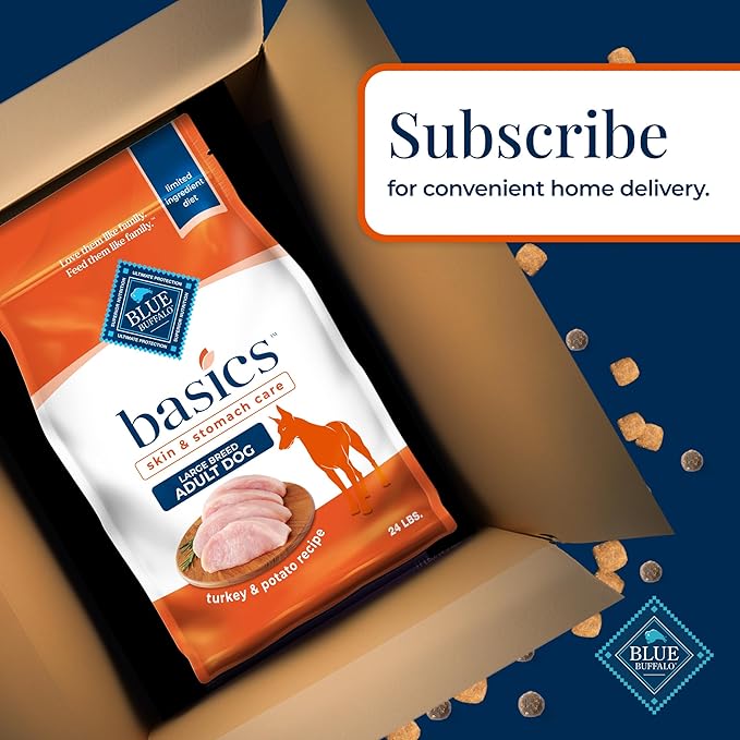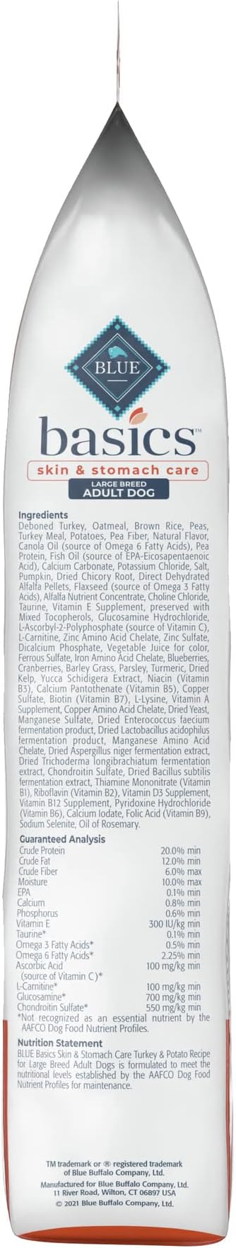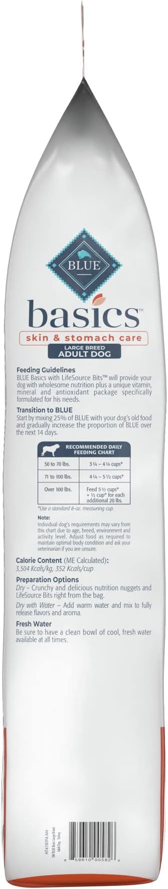• Contains: One (1) 24-lb. bag of BLUE Basics Grain-Free Large Breed Adult Dry Dog Food, Limited Ingredient Diet, Turkey, 24 lbs.