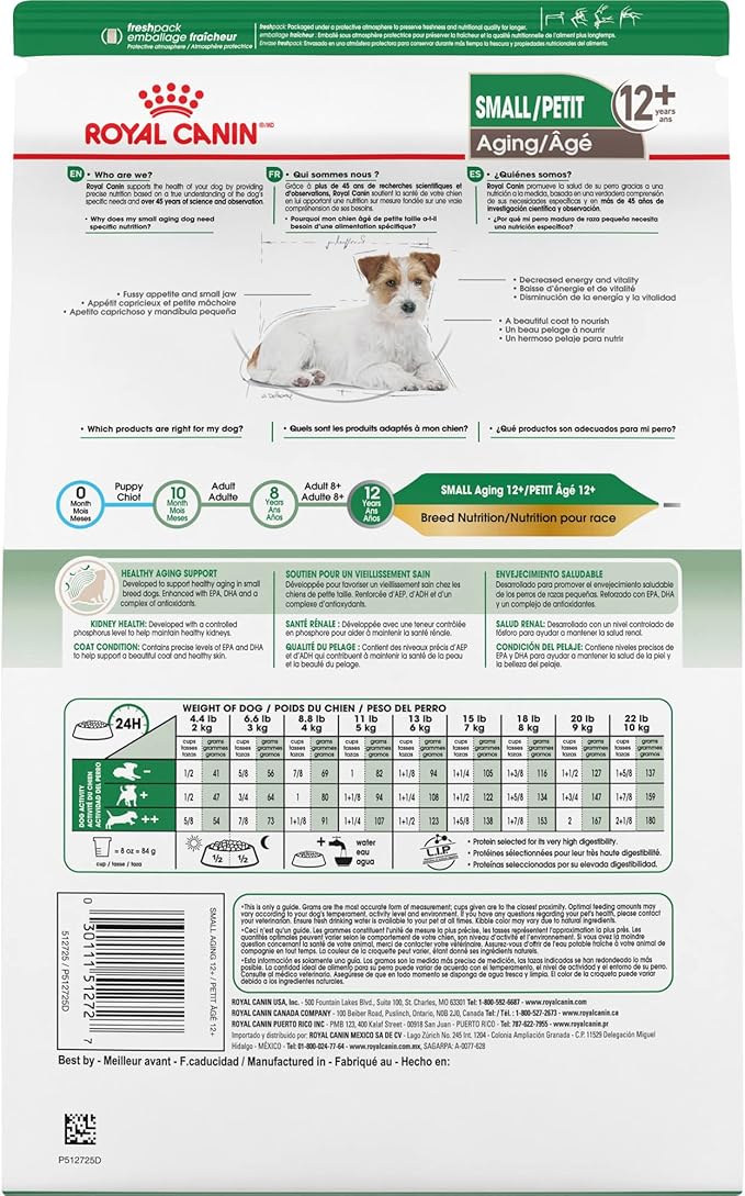 • SMALL BREED DOG FOOD: Royal Canin Small Aging 12+ Dry Dog Food is precise nutrition specifically made for small dogs 12 years and older weighing 9–22 lb