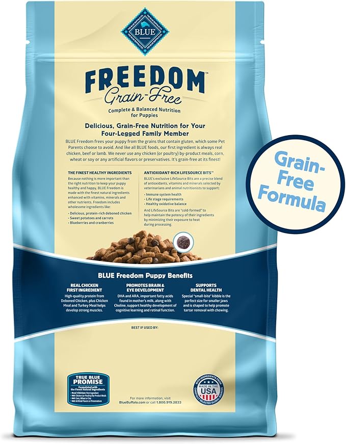 • Contains: One (1) 4-lb. bag of BLUE Freedom Grain-Free Dry Puppy Food, Chicken Recipe