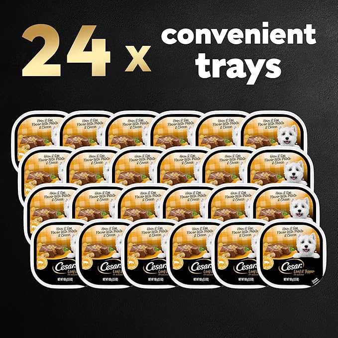 • Contains twenty-four (24) 3.5 oz. easy peel trays of CESAR Soft Wet Dog Food Loaf & Topper in Sauce Ham & Egg Flavor with Potato & Cheese