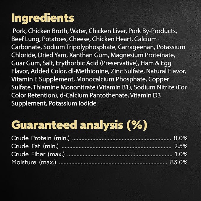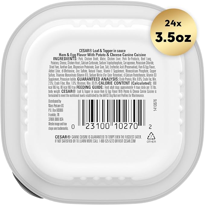 • Contains twenty-four (24) 3.5 oz. easy peel trays of CESAR Soft Wet Dog Food Loaf & Topper in Sauce Ham & Egg Flavor with Potato & Cheese