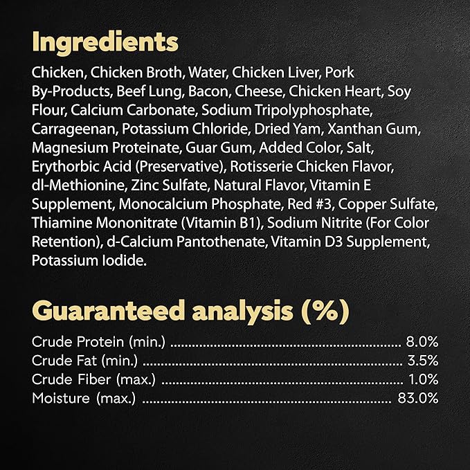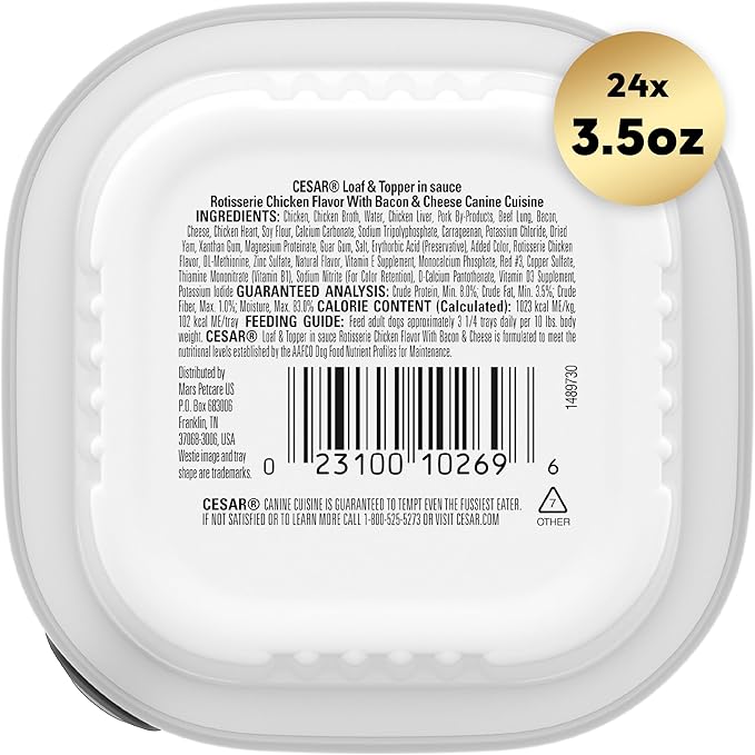 • Contains twenty-four (24) 3.5 oz. easy peel trays of CESAR Wet Dog Food Loaf & Topper in Sauce Rotisserie Chicken Flavor with Bacon & Cheese