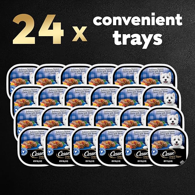 • Contains twenty-four (24) 3.5 oz. easy peel trays of CESAR Wet Dog Food Loaf & Topper in Sauce Rotisserie Chicken Flavor with Bacon & Cheese