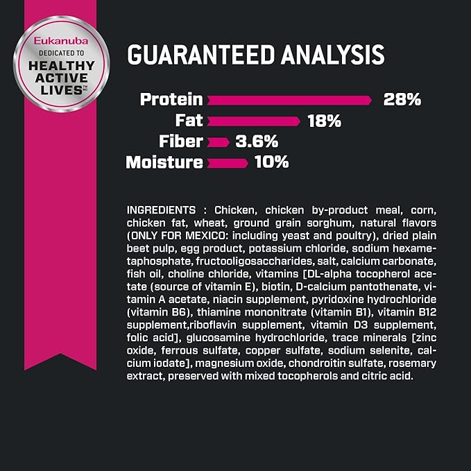 • Promotes lean muscle development and joint health in active adult dogs with a combination of animal protein, glucosamine, and chondroitin sulfate