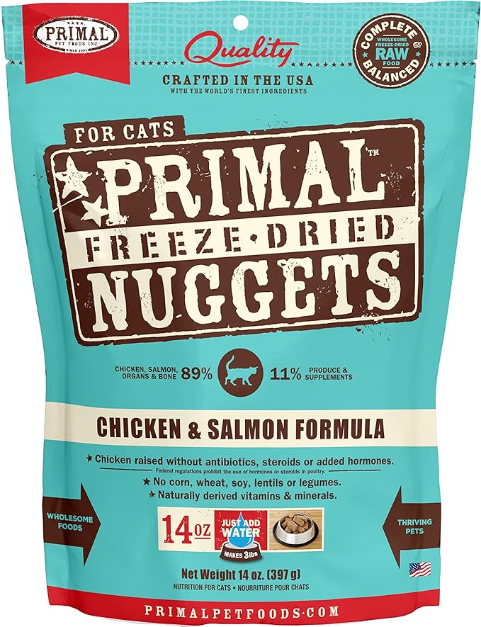 Primal Freeze Dried Cat Food Nuggets Chicken & Salmon; Complete & Balanced Meal or Topper; Premium, Healthy, Grain Free, High Protein Raw Cat Food with Probiotics (14 oz)