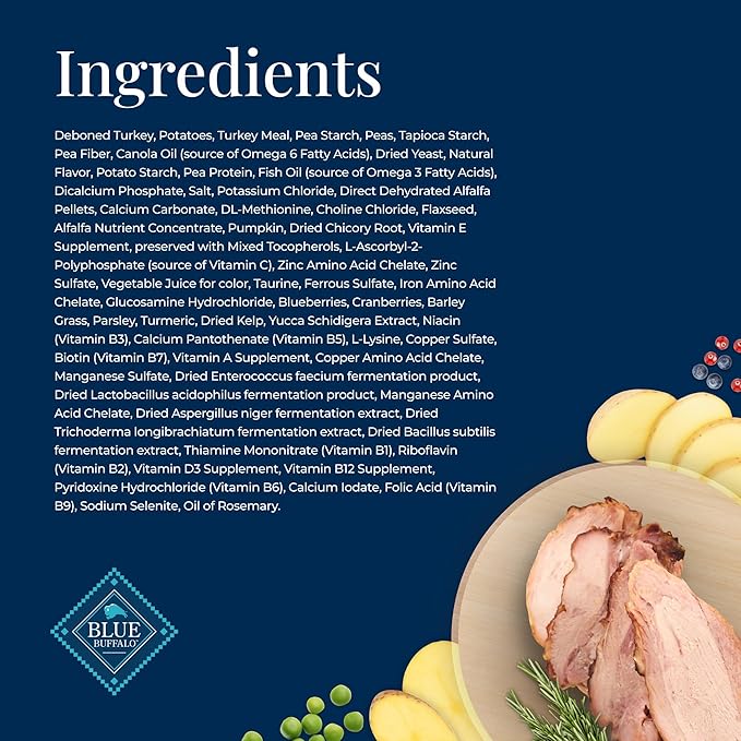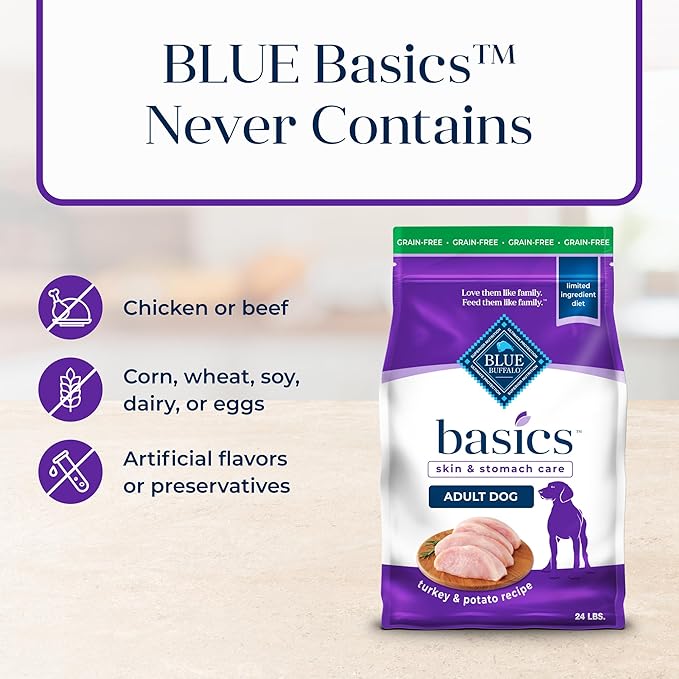 • Contains: One (1) 24-lb. bag of BLUE Basics Grain-Free Adult Dry Dog Food, Limited Ingredient Diet, Turkey, 24 lbs.