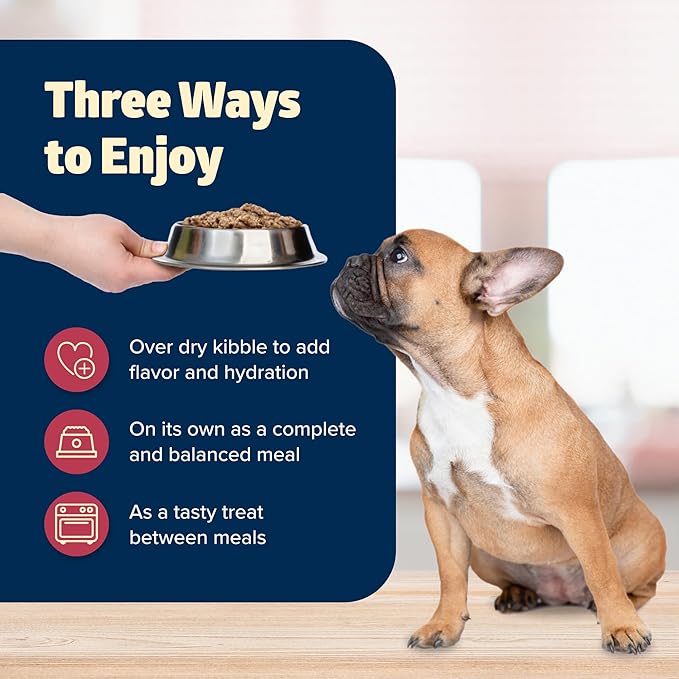 • FEED THREE WAYS: Mix this wet dog food into dry dog food, serve alone for a complete and balanced meal, or give as a tasty treat between meals