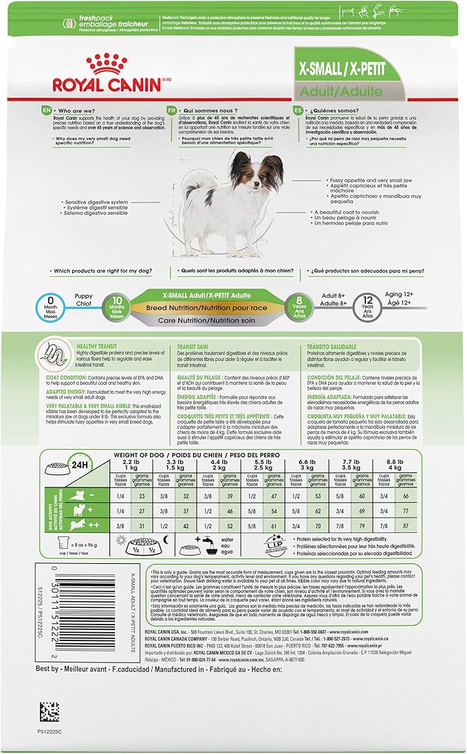 • X-SMALL BREED DOG FOOD: Royal Canin X-Small Adult Dry Dog Food is precise nutrition specifically made for toy and miniature breed dogs between 10 months and 8 years old that weigh up to 8 lb