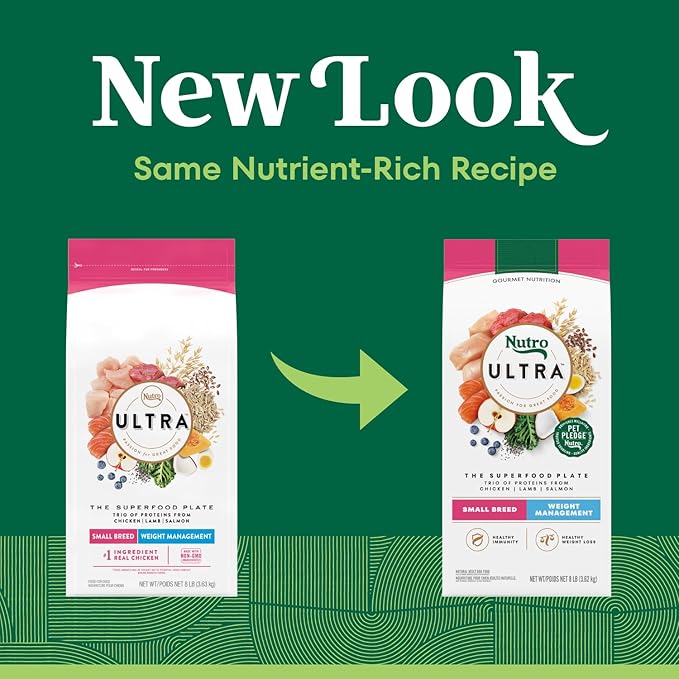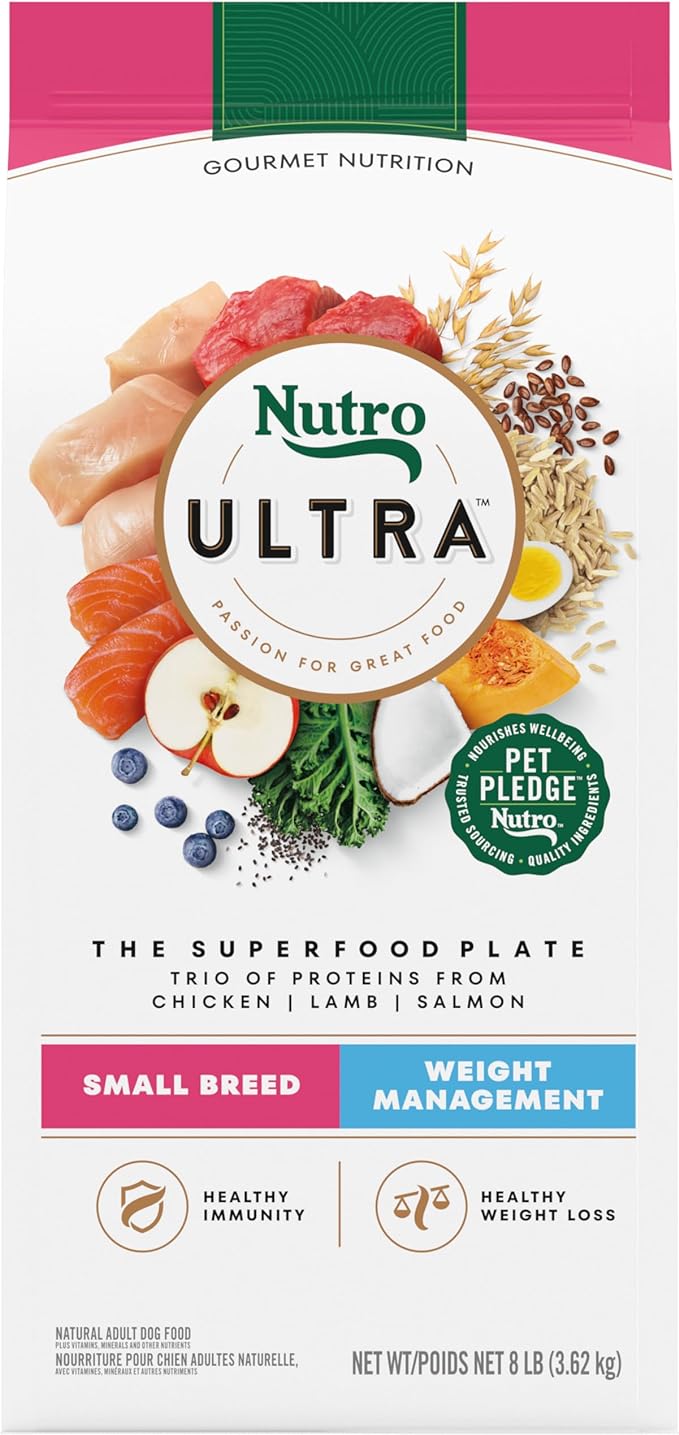 • Contains one (1) 8 lb. bag of NUTRO ULTRA Small Breed Adult Weight Management Dry Dog Food with a Trio of Proteins From Chicken, Lamb and Salmon