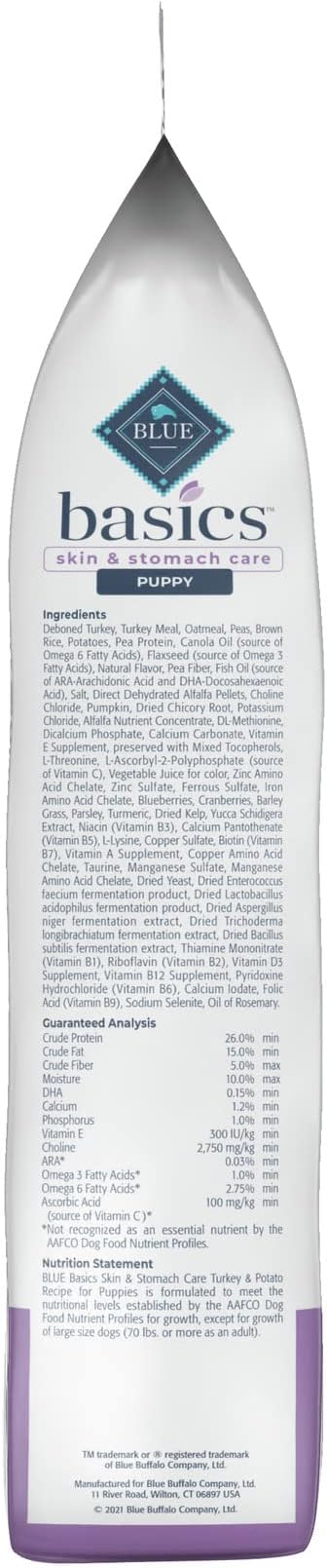 • Contains: One (1) 11-lb. bag of BLUE Basics Skin & Stomach Care Puppy Dry Dog Food, Turkey & Potato Recipe