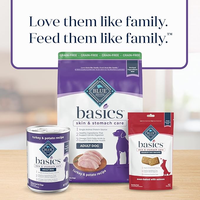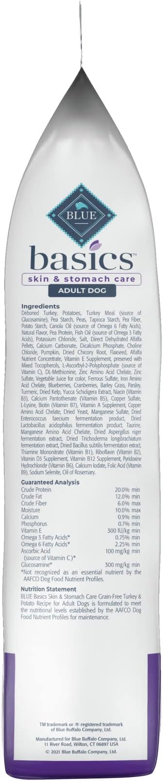 • Contains: One (1) 11-lb. bag of BLUE Basics Skin & Stomach Care Adult Grain-Free Dry Dog Food, Turkey & Potato Recipe