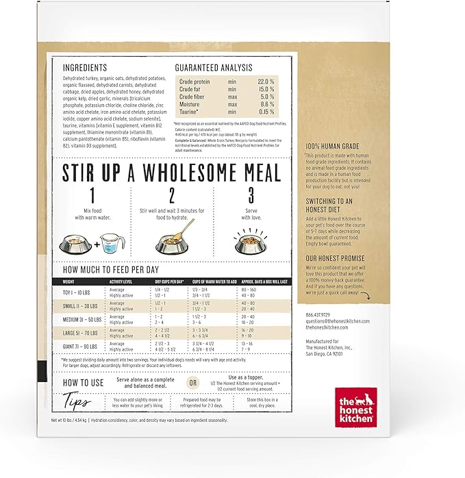 • CAGE FREE TURKEY & ORGANIC WHOLE GRAINS: The Honest Kitchen Whole Grain Turkey dog food is made with real whole food ingredients like cage free turkey, organic oats & apples, which are gently dehydrated for maximum nutrient retention & digestion.