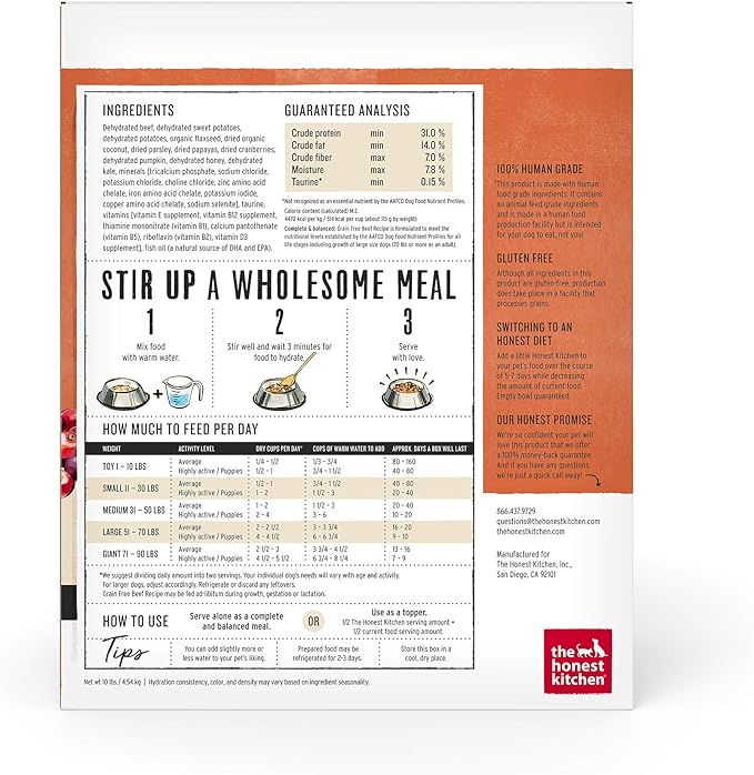 The Honest Kitchen Human Grade Dehydrated Grain Free Dog Food – Complete Meal or Dog Food Topper – Beef 10 lb (makes 40 lbs)