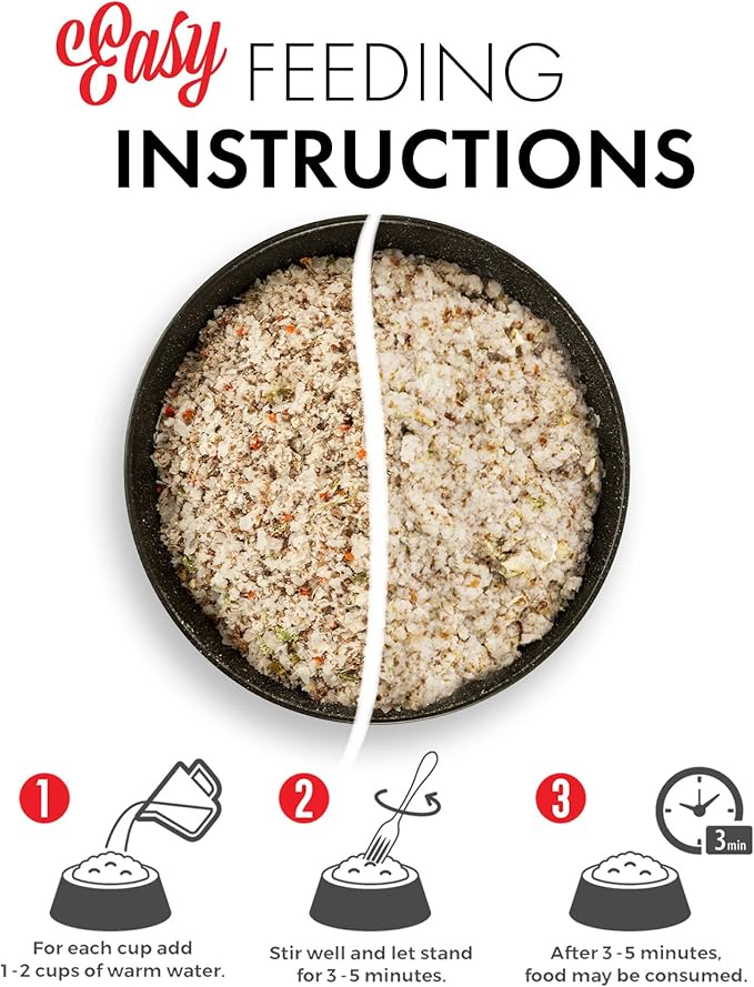 • JUST ADD WATER - For each cup of dog food add 1-2 cups of warm water. Stir well and let stand for 3-5 minutes