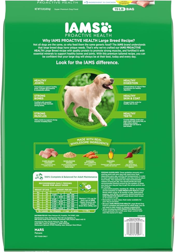 • Contains one (1) 15 lb. bag of IAMS Adult Large Breed Dry Dog Food for Large Dogs with Real Chicken