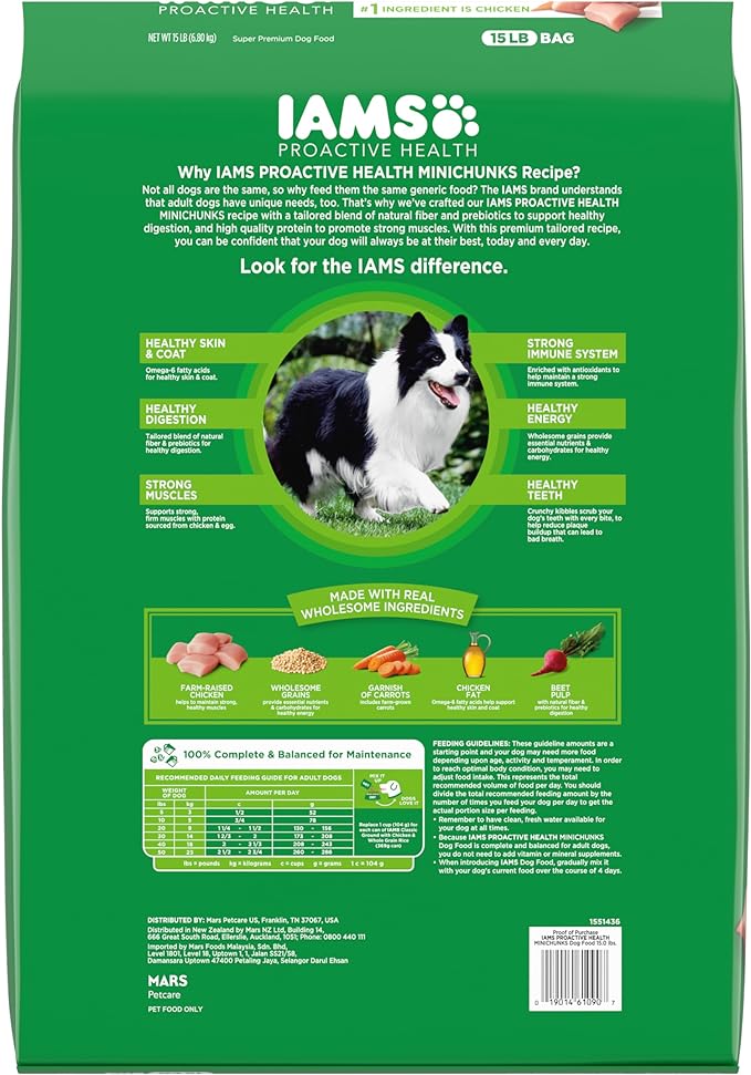 • Complete and Balanced for Adult Dogs: 100% complete and balanced adult dog food, 0% fillers, IAMS PROACTIVE HEALTH MINICHUNKS supports vibrant whole-body health with essential nutrients, and is enriched with antioxidants to support a strong immune system