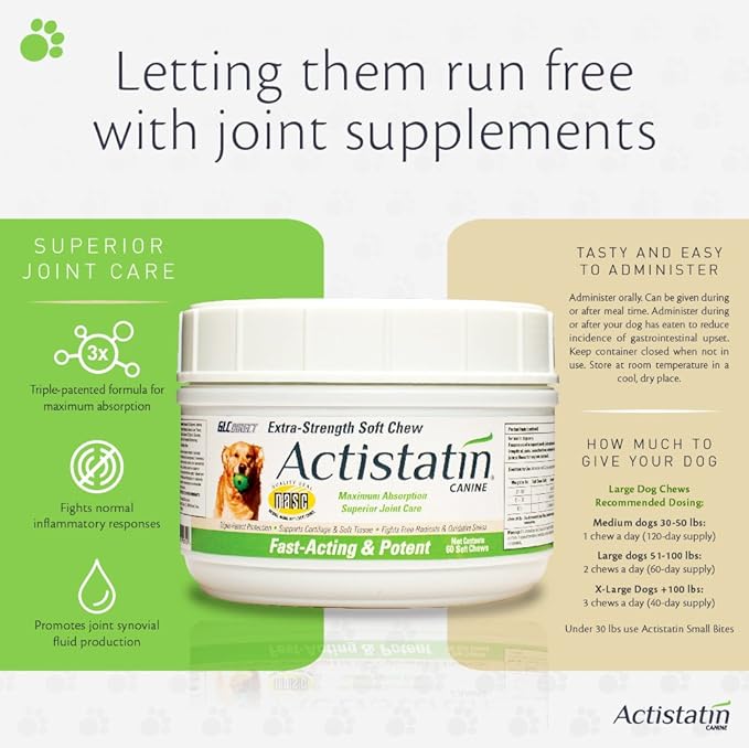 • DELICIOUS, EASY-TO-GIVE SOFT CHEWS FOR DOGS – Our Actistatin Canine Large Dog Soft Chews have the highest absorption in the industry to help naturally support your dog’s healthy joints, cartilage and soft tissue. Each delicious soft chew contains an advanced, triple-patented formula that includes Glucosamine, Chondroitin, Manganese and MSM (Methylsulfonylmethane) – plus antioxidants, free-radical fighters, beneficial fatty acids and more – for superior joint function and health.