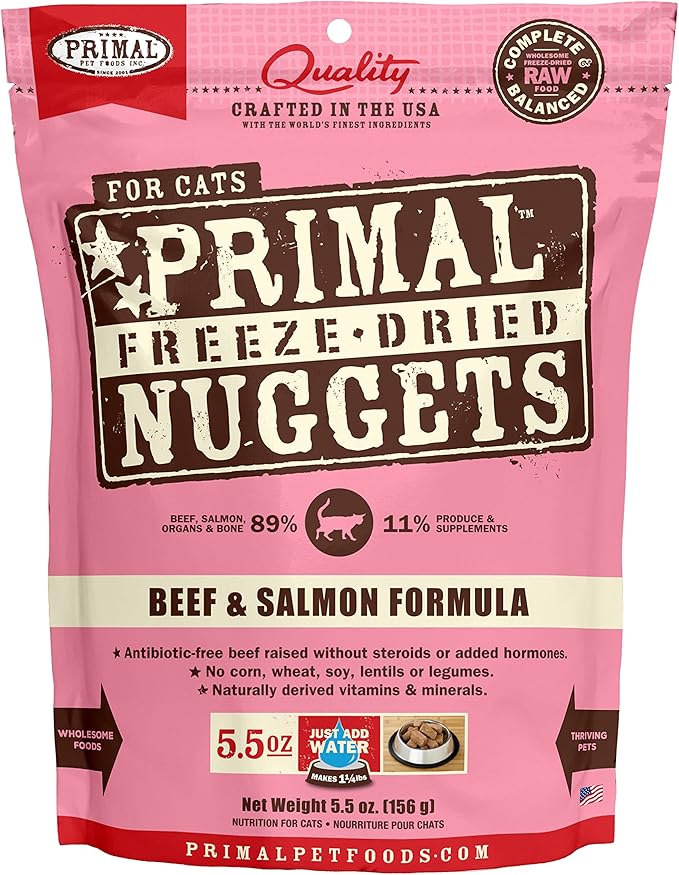 Primal Freeze Dried Cat Food Nuggets Beef & Salmon; Complete & Balanced Meal or Topper; Premium, Healthy, Grain Free, High Protein Raw Cat Food with Probiotics (5.5 oz)