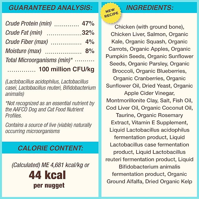 • Premium freeze-dried raw cat food made with made with cage-free chicken raised without antibiotics, steroids or added hormones, wild-caught salmon and USDA certified organic fruits and vegetables. Grain free