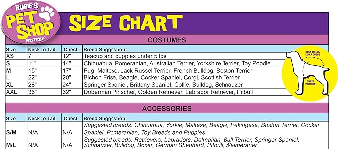 • READ THE RUBIE’S PET SIZE CHART and WATCH THE SIZING INSTRUCTION VIDEO, do not select size based on breed; consider costume style and animal shape before ordering