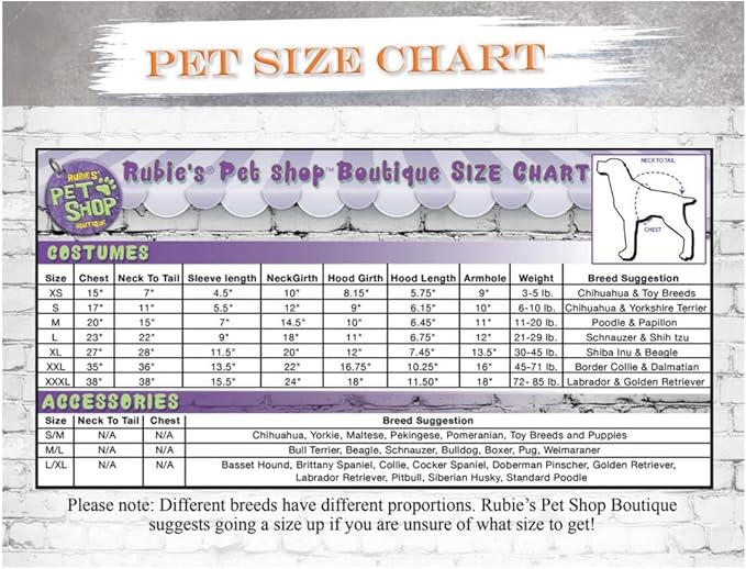 • READ THE RUBIE’S PET SIZE CHART and WATCH THE SIZING INSTRUCTION VIDEO, do not select size based on breed; consider costume style and animal shape before ordering