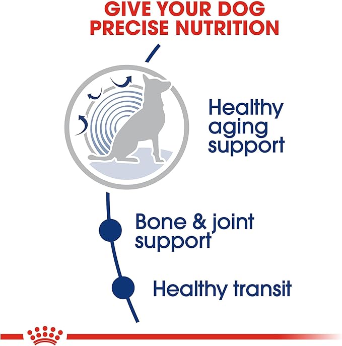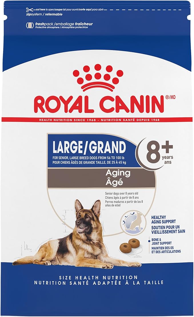 • Royal Canin Large Aging 8+ dry dog food (formerly Maxi Aging 8+) is precise nutrition specifically made for large dogs 8 years and older weighing 56–100 lbs.