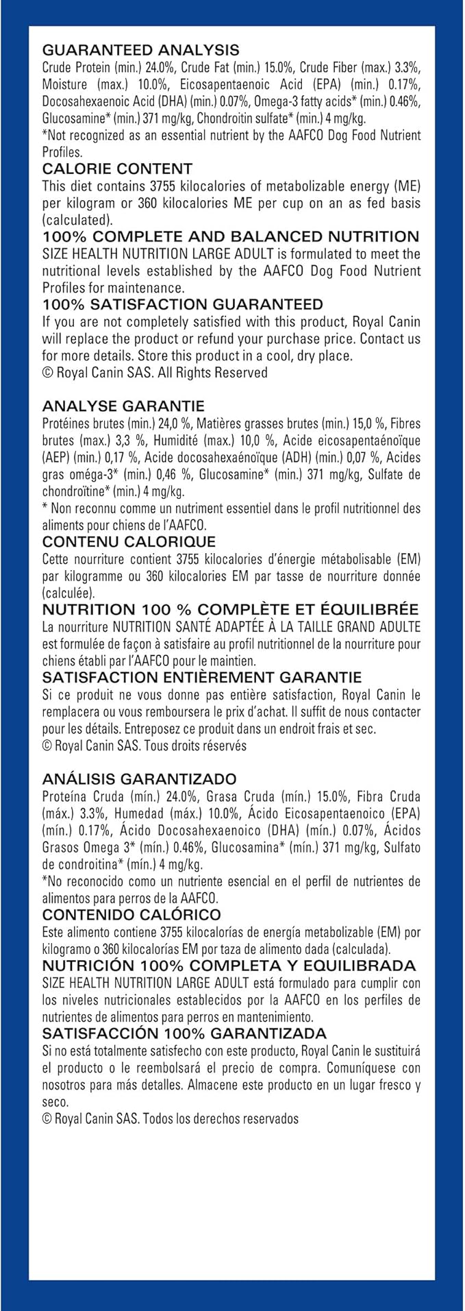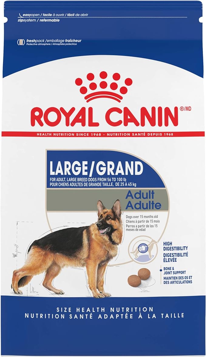 • Royal Canin Large Adult dry dog food (formerly Maxi Adult) is precise nutrition specifically made for large dogs 15 months to 5 years old weighing 56–100 lbs.