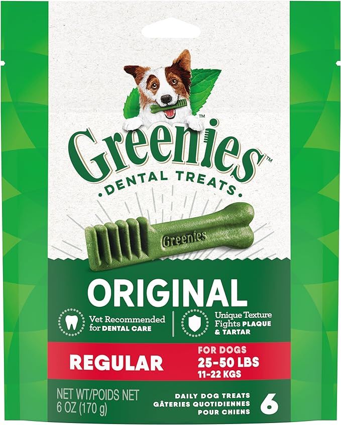 • Contains one (1) 6 oz. 6-count pack of GREENIES Original Regular Size Natural Dental Dog Treats; Natural Dog Treats Plus Vitamins, Minerals and Other Nutrients for medium dogs