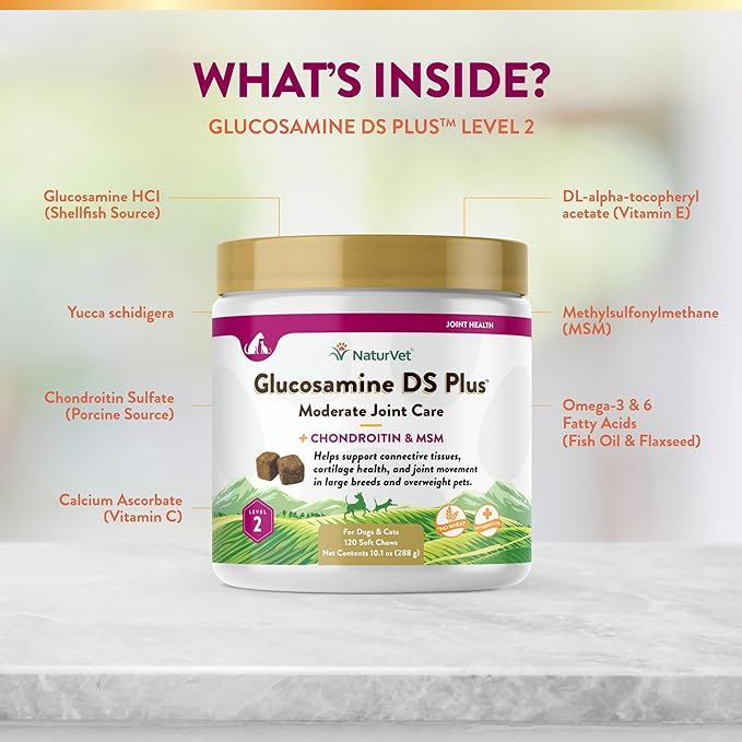 NaturVet – Glucosamine DS Plus - Level 2 Moderate Care – Supports Healthy Hip & Joint Function – Enhanced with Glucosamine, MSM & Chondroitin – for Dogs & Cats–120 Soft Chews