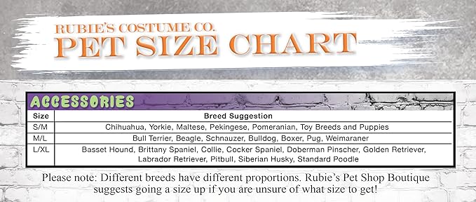 • READ THE RUBIE’S PET SIZE CHART and WATCH THE SIZING INSTRUCTION VIDEO, do not select size based on breed; consider costume style and animal shape before ordering