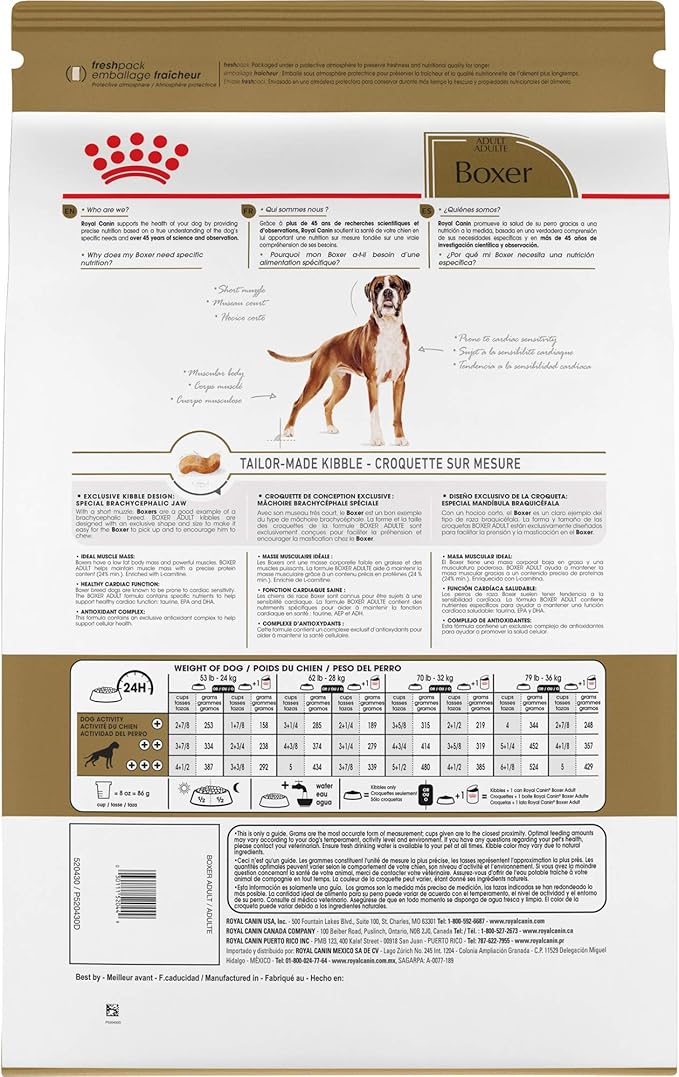 • Royal Canin Boxer Adult dry dog food is designed to meet the nutritional needs of purebred Boxers 15 months and older