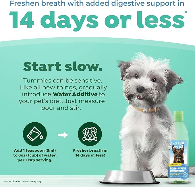 • HAPPY & HEALTHY — Dogs with sensitive stomachs or new to Fresh Breath for Dogs should start with 1/2 the recommended dose. Fresh dog breath results in 14 days or less when the directed dosage is reached.