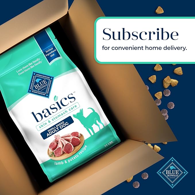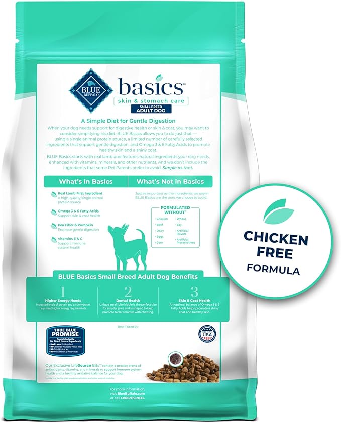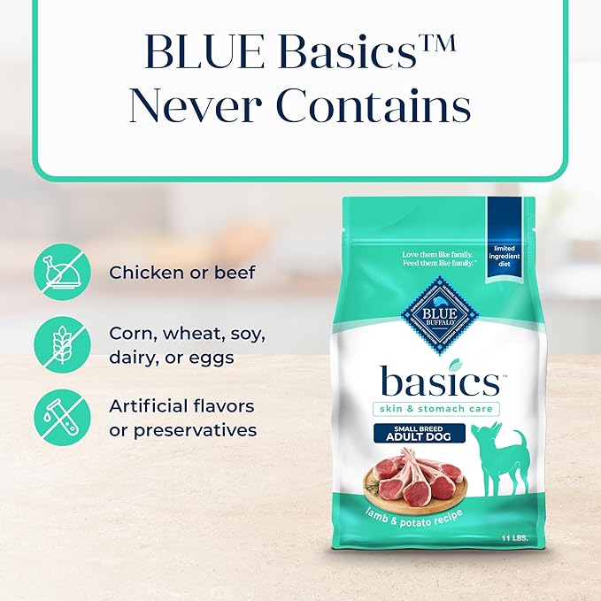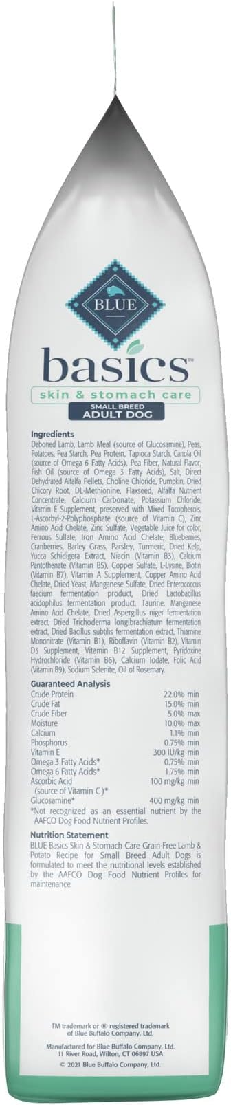 • Contains: One (1) 11-lb. bag of BLUE Basics Skin & Stomach Care Small Breed Adult Grain-Free Dry Dog Food, Lamb & Potato Recipe