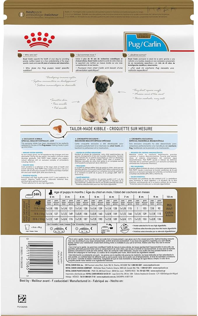 • Royal Canin Pug Puppy dry dog food is designed to meet the nutritional needs of purebred Pugs 8 weeks to 10 months old