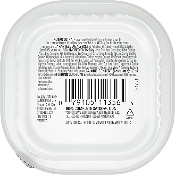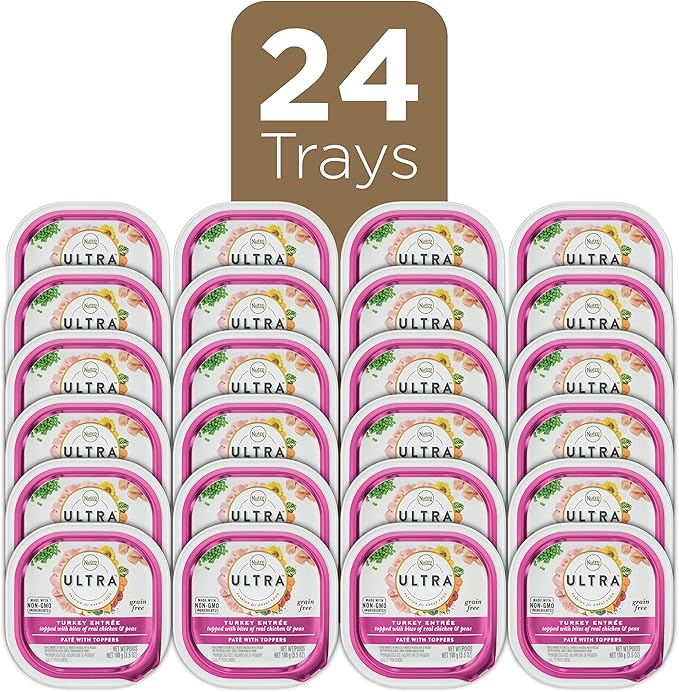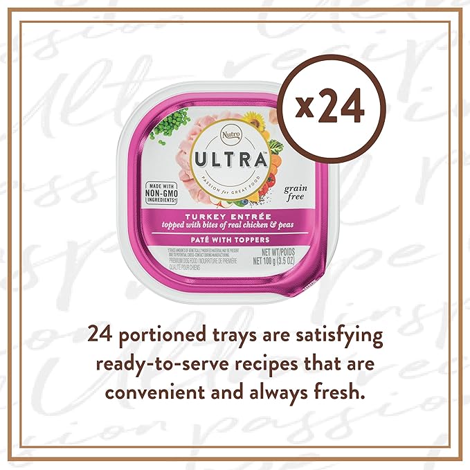• Contains twenty-four (24) 3.5 oz. trays of NUTRO ULTRA Grain Free Adult Wet Dog Food Paté With Toppers Turkey Entrée topped with bites of real chicken & peas
