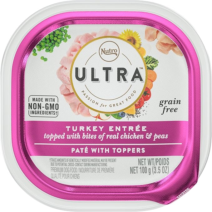 NUTRO ULTRA Grain Free Adult Soft Wet Dog Food Paté With Toppers Turkey Entrée topped with bites of real chicken & peas, 3.5 oz. Trays, Pack of 24