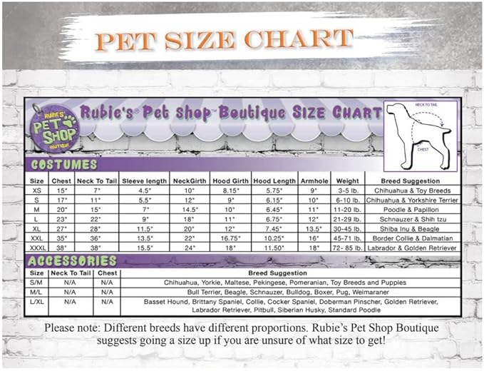 • READ THE Rubie’s Pet Size Chart and watch the measuring video before making size selection