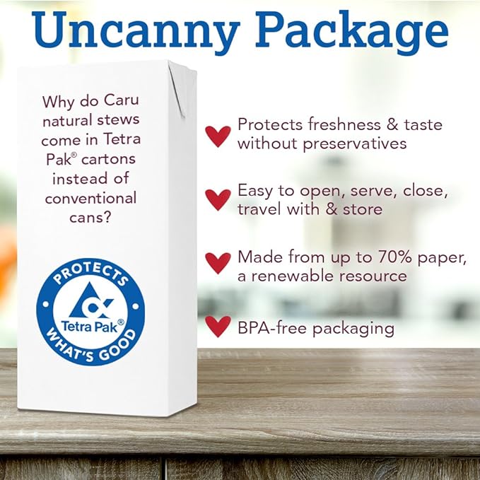 • Packaging Protects What'S Good: The Proprietary Cooking And Packaging Process Unique To Caru Is What Makes Every Recipe Look, Smell And Taste More Like Homemade. Easy To Open, Serve, Close, Travel With And Store. And, The Freshness, Homemade Quality And Flavor Of Our Stews Can Be Protected Without Preservatives Of Any Kind. Packaging Is Bpa-Free , Which Is Good For Your Pet’S Health And They’Re Also Made From Recyclable, Eco-Friendly, Renewable Materials, Which Is Good For People As Well As Our Planet.