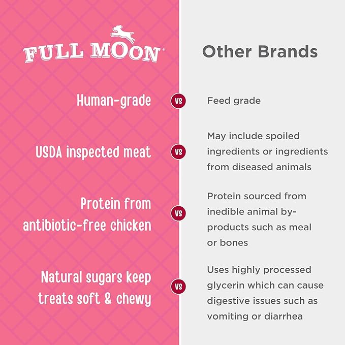 • U.S.-GROWN CHICKEN: Full Moon treats are proudly made in the United States using regionally sourced ingredients, including USDA approved, antibiotic-free chicken.