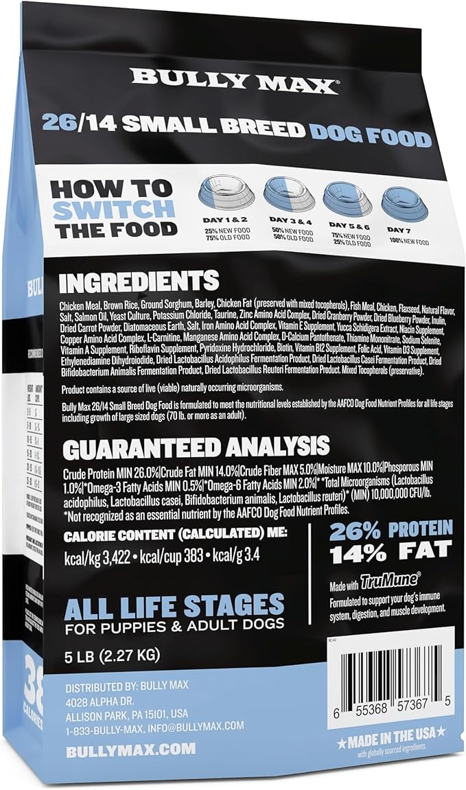 • OPTIMAL NUTRITION FOR SMALL BREEDS: Bully Max 26/14 offers specialized, meat-rich nutrition for puppy or adult small dog breeds. This dry dog food features small soft bites perfect for easy chewing, supporting skin, coat, and digestive health. It's a healthy dog food option that delivers 100% balanced nutrition in every bite for puppies, adults, and seniors alike. It's a one-stop solution for Frenchies or French Bulldogs and other small breed dog's dietary needs.
