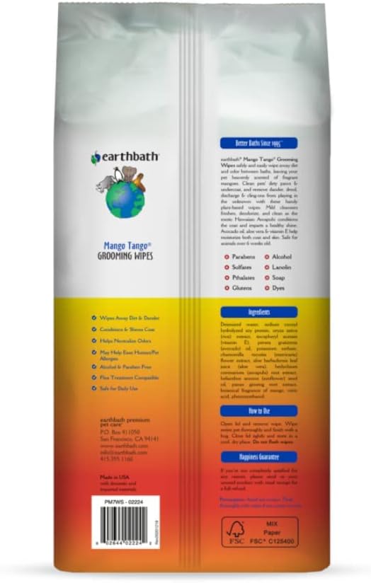 earthbath, Mango Tango Grooming Wipes - Dog Wipes for Paws and Butt, Best Pet Wipes for Dogs & Cats, Made in USA, Cruelty-Free Dog Cleaning Wipes, Removes Dirt & Dander - 100 Count (2 Pack)