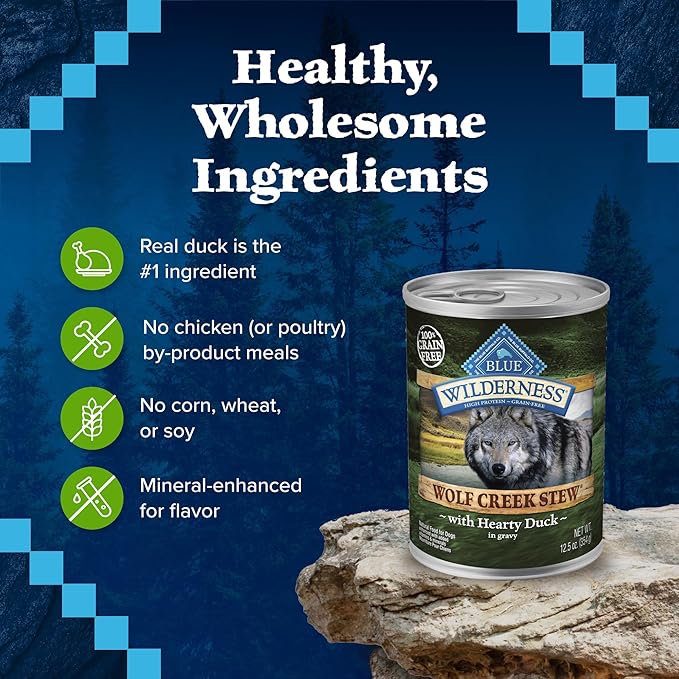 • Contains twelve (12) 12.5-oz cans of BLUE Wilderness Wolf Creek Stew High Protein Grain Free, Natural Wet Dog Food, Hearty Duck Stew in gravy
