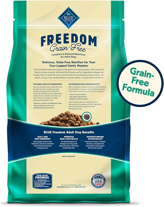 • Contains: One (1) 24-lb. bag of BLUE Freedom Grain-Free Dry Dog Food, Lamb Recipe