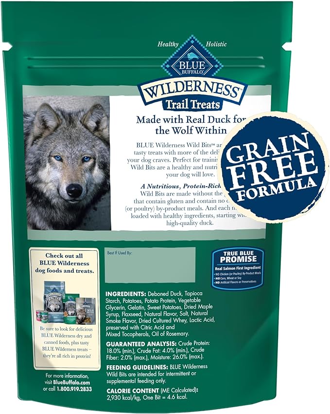 • Contains one (1) 4-oz. bag of BLUE Wilderness Trail Treats Wild Bits High Protein Grain Free Soft & Chewy Training Dog Treats, Duck Recipe