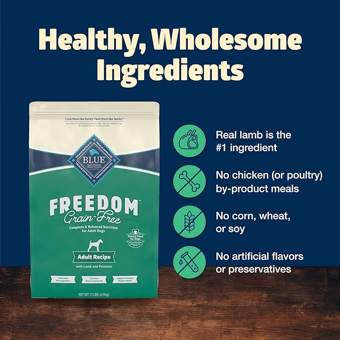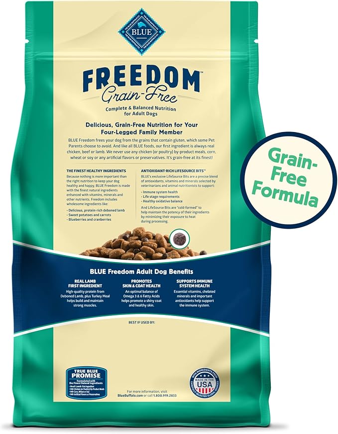 • Contains: One (1) 11-lb. bag of BLUE Freedom Grain-Free Dry Dog Food, Lamb Recipe
